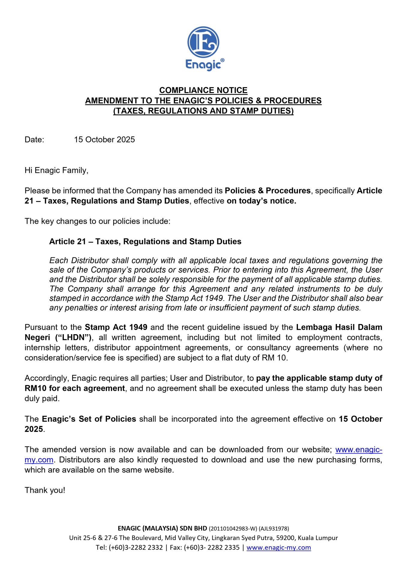 Compliance Notice | Amendment to the Enagic’s Policies & Procedures (Taxes, Regulations and Stamp Duties)October 15, 2025Enagic WebmasterCompliance News, News0 Comments5 Enagic WebmasterRelated Posts Compliance Notice | Withholding Tax (10%) Deduction on Non-Resident Distributor Commissions on the Sale of All Product Compliance Notice | Prohibition on Raiding and Cross-Solicitation of Products or Other MLM and/or Business Opportunities Compliance Notice | Enagic Products on Third-Party Online PlatformShare This Twitter Facebook LinkedIn Email